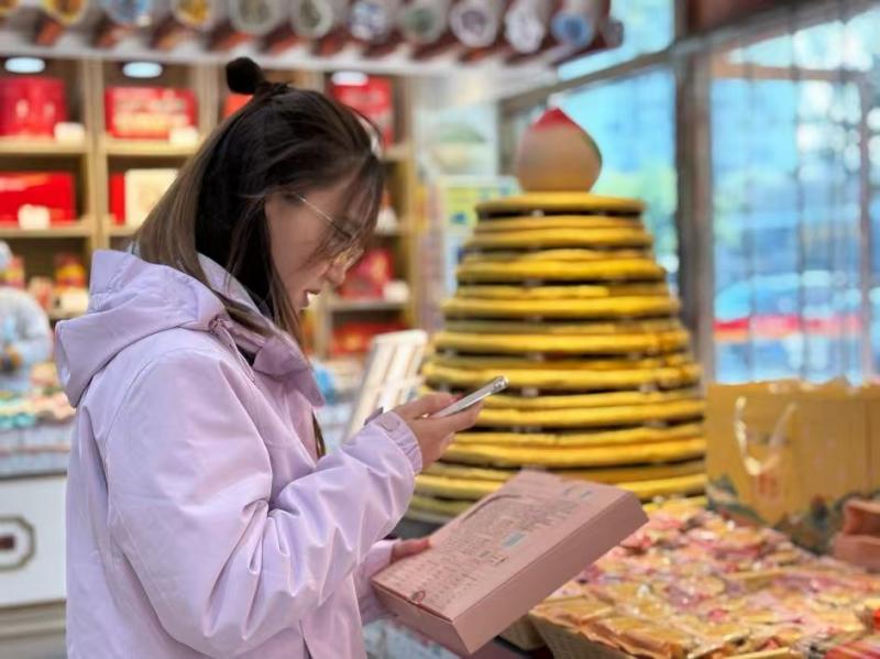 今年最让人眼前一亮的,当属礼盒上的“温情留声”二维码。消费者扫描礼盒背面的专属二维码,只需按住录音键,就能将叮嘱、祝福录入,收到礼盒的人再次扫码,就能听见这份“有声”的心意。正在选购的王女士边扫码边展示:“往年送父母花糕只是份心意,今年还能把想说的话录进去,他们扫码就能听,既亲切又有新意。”