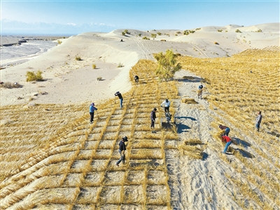 10月18日,施工人员在库姆塔格沙漠“锁边工程”项目建设现场铺设沙障