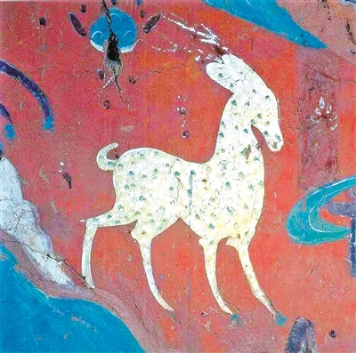 在用色方面,《鹿王本生图》看似用色非常鲜艳,实际上用色量很少,仅有6种。土红色在整幅画中所占比重较大,这是魏晋南北朝时期一个较为突出的用色特点。再辅以石青、石绿点缀,加以黑、白、灰三色调和,缓和了土红和石绿石青在对比上的强烈,做到冷暖对比和谐,同时也衬托出对比色的鲜亮程度。