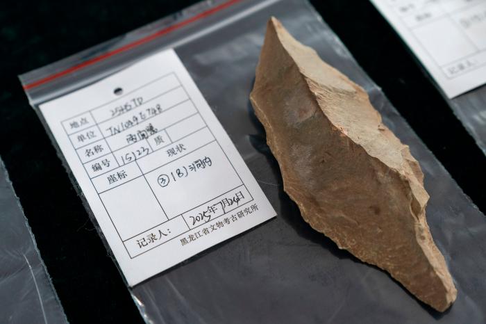 来自中国社会科学院、吉林大学、山东大学、南京大学等单位的专家一致认为石人洞遗址是国内罕有的史前石器原料开采地及加工厂,出土石制品数量巨大,具有重要的考古价值。这是10月20日在海林市石河村拍摄的石人洞遗址中发掘出的石器。