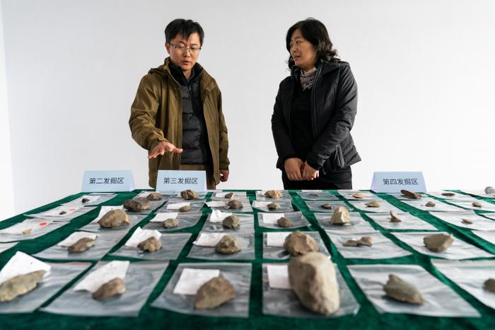 经过黑龙江省考古研究所考古人员的系统考古发掘,目前已出土20余万件石制品,展现了古人制作石器的智慧与技术,为研究旧新石器时代过渡、区域文明演进模式提供了关键线索。10月20日,在海林市石河村,黑龙江省文物考古研究所副所长、石人洞考古发掘项目负责人李有骞(左)向山东大学考古学院院长、教授王芬介绍石人洞遗址中发掘出的石器。