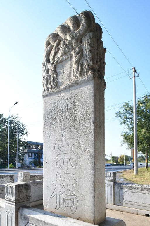 建于明正统十三年(1448年)的朝宗桥,是一座七孔联拱石桥,南北横跨于北沙河上,该桥曾是连接京师与明陵的重要通道,明朝帝后谒陵北巡皆经由此地。1984年,朝宗桥被列为市级文保单位。历经577年风雨的朝宗桥巍立如初,现为京藏高速路进京方向辅路的公路桥,继续服务于现代交通。在朝宗桥北端东侧,有一块桥名碑,即朝宗桥碑,为螭首方座汉白玉石碑,立于1576年,比朝宗桥建成晚128年,碑额两面分别刻篆书“大明”二字。资料记载,此碑通高4.08米、宽1.1米、厚0.39米。