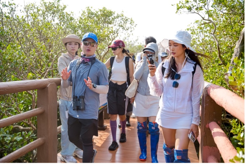 接着,众人来到广东湛江高桥红树林。这里是广东湛江红树林国家级自然保护区的核心地带,是我国大陆连片面积最大的一片红树林,汇集了木榄、红海榄等多种红树植物,也为众多滨海生物提供了理想家园。招潮蟹高举红螯在洞口巡视,弹涂鱼借助胸鳍奋力跳跃,鼓虾螯足开合发出清脆的“哒哒”声,整片滩涂洋溢着蓬勃的生命活力。不远处,专家指向更广阔的海域介绍,红树林远处的海域也是“海中大熊猫”中华白海豚重要的觅食场和栖息地。作为第十五届全运会吉祥物的原型,中华白海豚的畅游正是对这片海域生态健康的最佳认证。