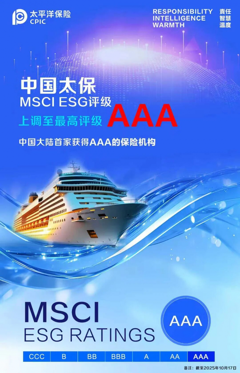 近日,根据明晟(MSCI)公司公布的最新评级情况,中国太保2025年评级由“AA”再次获得上调,达到最高评级“AAA”,成为首家获得该评级的中国大陆保险机构。