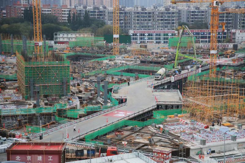 “项目体量庞大,地下建筑面积15.8万平方米。其中,基坑平面面积6.26万平方米,比8个标准足球场的面积还大。”项目施工方、北京建工安宁庄项目经理刘帆介绍,基坑水平跨度达350米,深度达20米,属大平面超深基坑工程,场内道路极为狭窄,而且无法形成道路循环,这些都为结构施工铺展后材料的运输和生产的组织带来了极大的考验,处理不好这些问题,将直接制约工期。