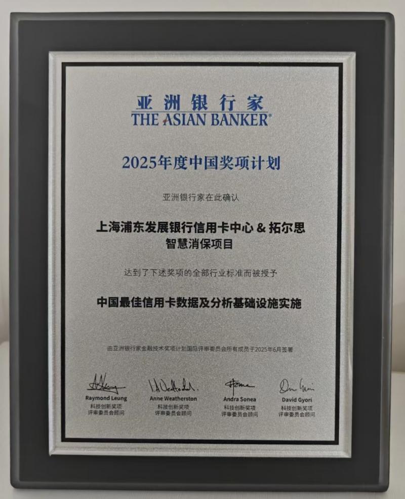 近日,备受瞩目的《亚洲银行家》“2025年度中国奖项计划”结果揭晓,浦发银行信用卡凭借其在消保领域的创新技术实施,荣获“中国最佳信用卡数据及分析基础设施实施”奖项。作为全球金融服务行业的战略信息领导者,《亚洲银行家》举办的年度奖项以其专业性、公正性和广泛的影响力而闻名,这一荣誉再次彰显国际权威机构对浦发银行信用卡在金融科技创新领域的卓越贡献和领先地位的肯定。