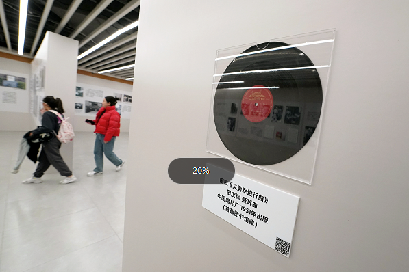 展览核心部分“风云儿女多慷慨”“战歌一曲遍天下”翔实呈现《义勇军进行曲》的创作与传播历程。展厅内一张1951年版《义勇军进行曲》唱片,承载着1949年政协会议上关于国歌的讨论。现场展出的田汉手稿照片,体现出他将国歌的确立视为“新诗歌音乐界的荣誉”。记者注意到,现场所有实体老唱片均支持扫码试听,观众可聆听不同时期的珍贵录音。