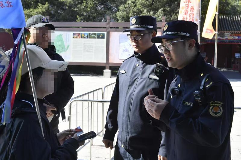 在香山公园入口处,海淀区香山街道综合行政执法队的执法队员对旅游团带队导游的资质进行检查,并提示参团游客选择正规旅游团,游园时要爱护环境。巡查过程中,执法队员联合香山公园管理处重点关注园内人员较为集中的区域,随时提醒正在拍照的游客,在拍照过程中注意不要触碰或者倚靠花木。