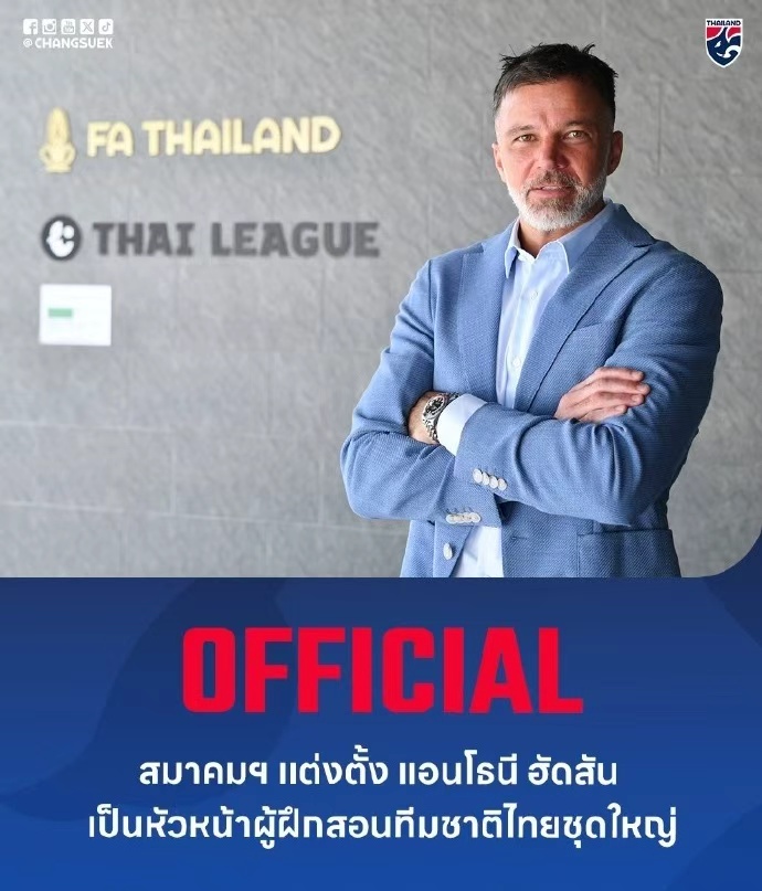 在宣布日本籍主教练石井正忠下课后不到48小时,泰国足协于10月23日通过官方渠道宣布,现年44岁的美国籍教练员安东尼·哈德森将成为泰国男足新一任主教练。他的首要带队任务是率队冲击2027年亚洲杯正赛入场券。