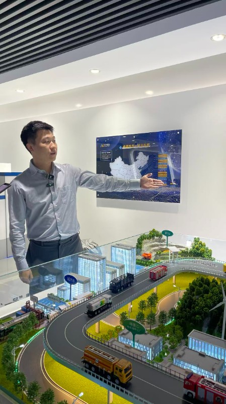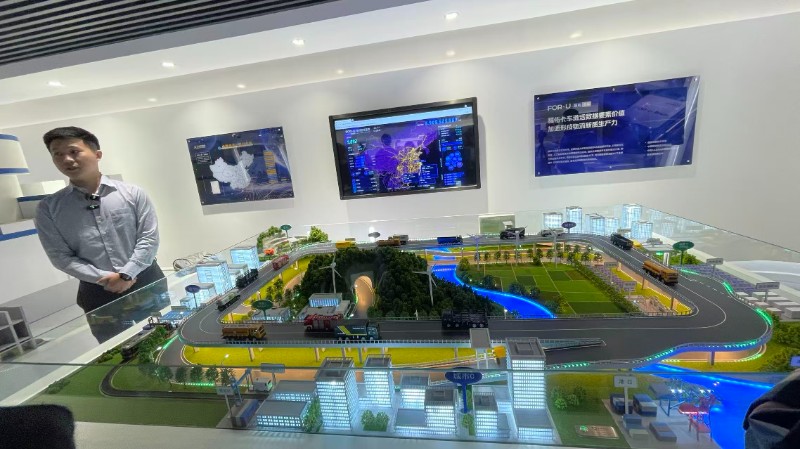 在中关村西城园成果展示中心,福佑卡车公路货运数智化沙盘模型正在演示依托大数据、人工智能等技术构建智能物流系统,将整个货运交易链条数字化、标准化、智能化,为客户提供全链路数字化履约解决方案。