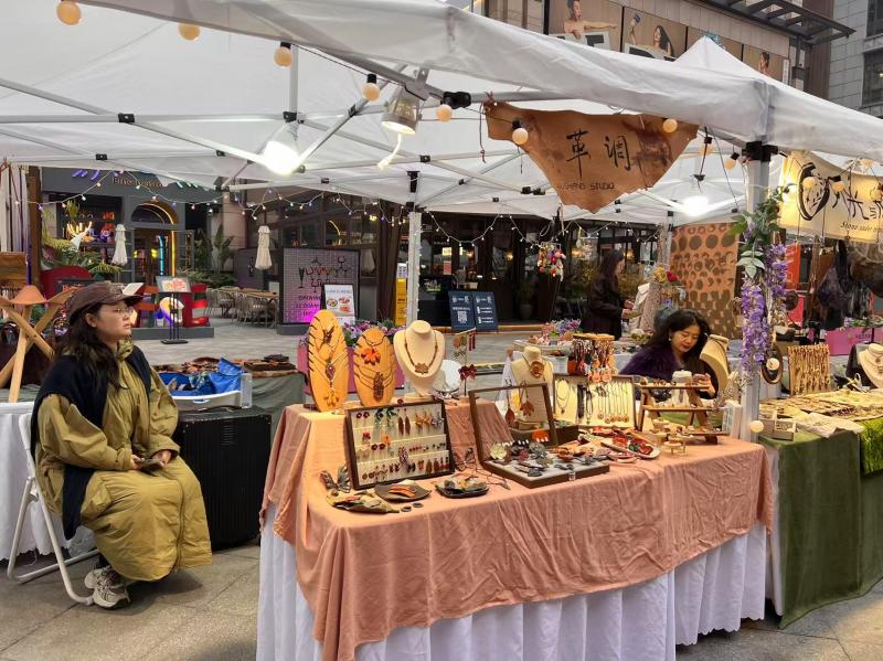 一顶顶白色帐篷下,包括原创穿戴甲、非遗点翠和宋锦、原石绕线饰品、瓷谷屋等在内的文创好物颇受欢迎。泰康美术馆和上海美术电影制片厂联合带来《浪浪山小妖怪》《大闹天宫》《哪吒闹海》等经典国漫正版周边,秀水街大厦多家国潮风店铺参与了变装秀和互动拍照。活动还设置了集章环节,游客持“小米粒收集计划”集章卡可在中骏世界城的部分店铺享受优惠。