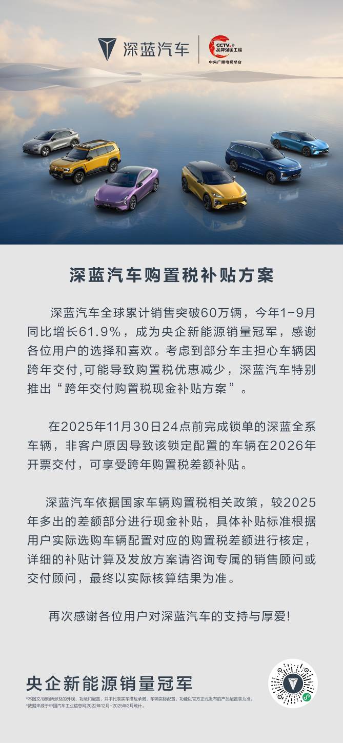 据了解,深蓝汽车此次推出的“跨年交付购置税现金补贴方案”,在2025年11月30日24点前完成锁单的深蓝全系车辆,非客户原因导致该锁定配置的车辆在2026年开票交付,可享受跨年购置税差额补贴。