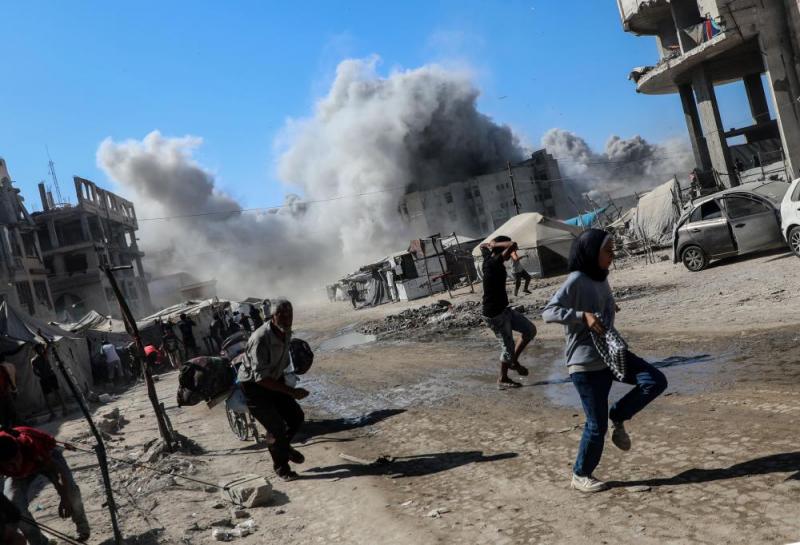 2025年9月8日,加沙城一座高层建筑遭以色列军队空袭后升起浓烟,民众纷纷躲避。新华社发(里泽克·阿卜杜勒贾瓦德摄)