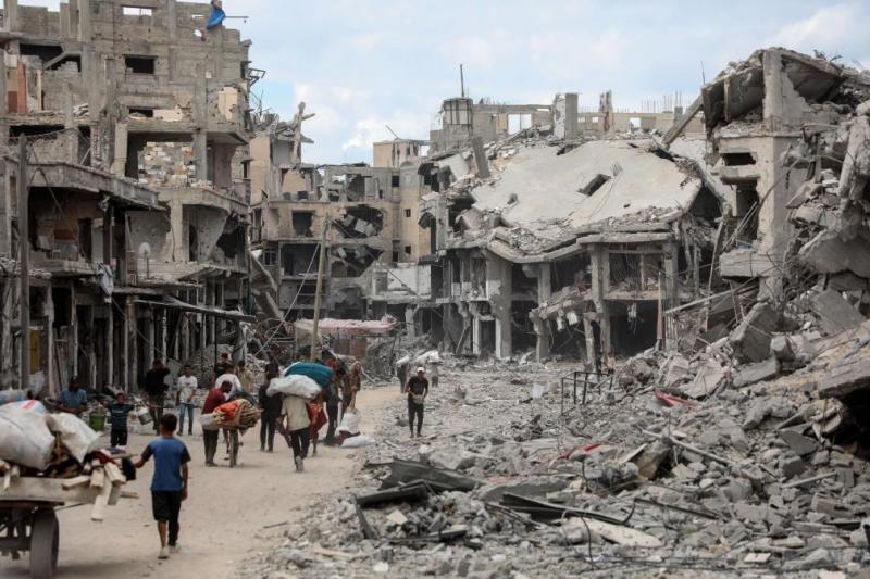 2025年10月12日,在加沙地带南部汗尤尼斯,重返家园的巴勒斯坦人走过严重受损的建筑。新华社发(里泽克·阿卜杜勒贾瓦德摄)