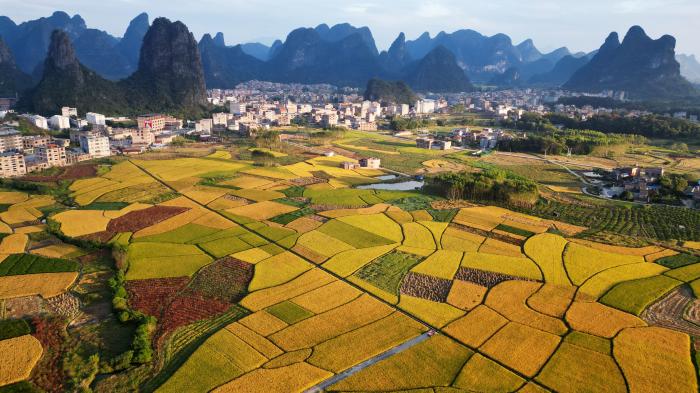 10月24日拍摄的贺州市昭平县黄姚镇枧盘村的稻田风光(无人机照片)。新华社发(黄旭胡摄)