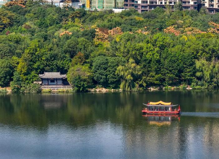 10月24日,在湖北省黄冈市遗爱湖公园,游人乘车游船游览(无人机照片)。新华社发(赵军摄)
