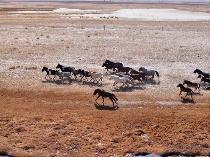 10月23日,甘肃省阿克塞哈萨克族自治县阿勒腾乡哈尔腾高原的马群驰骋在金色草原上(无人机照片)。新华社发(高宏善摄)