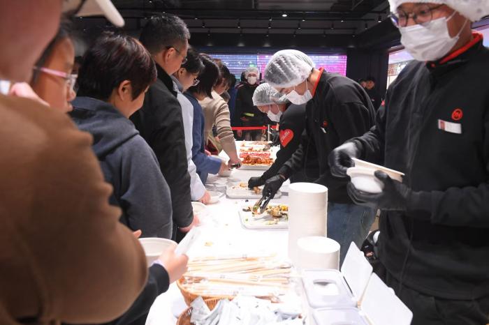 熟食档口的热气裹着香气弥漫开来,便民服务区的休息座椅上,几位顾客正悠闲地品尝着免费茶饮。