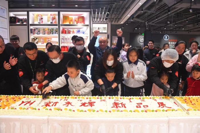 店员和小顾客共同分切蛋糕庆祝调改一周年 。