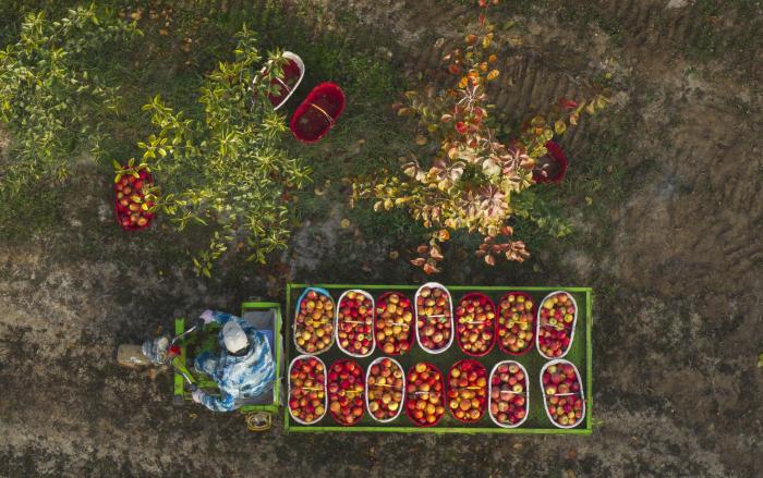 10月23日,在新疆生产建设兵团第一师阿拉尔市六团三连苹果园,林果业服务队队员运输刚采摘的苹果(无人机照片)。