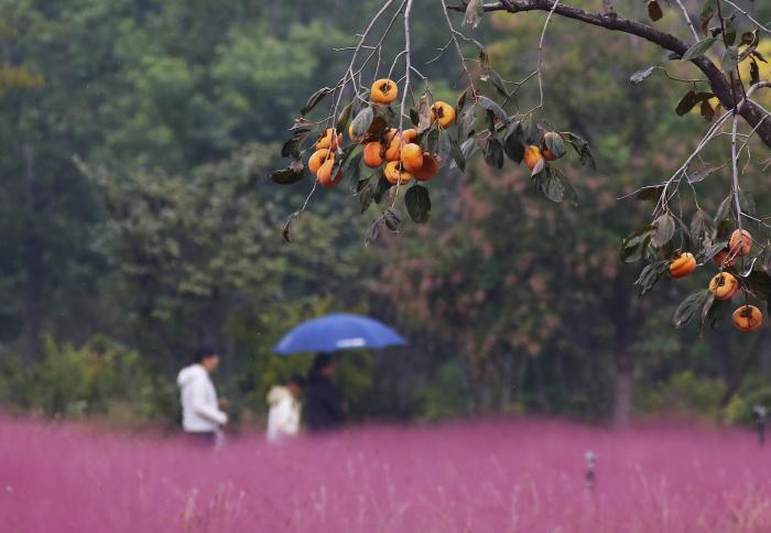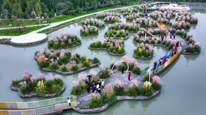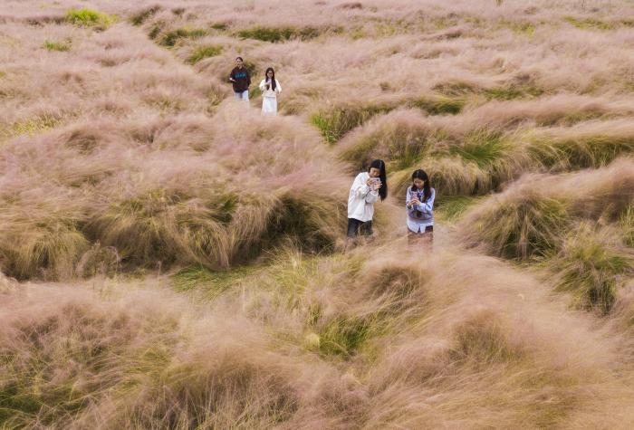 10月25日,游客在浙江省金华职业技术大学校园观赏、拍摄粉黛乱子草(无人机照片)。新华社发(时宽兵 摄)