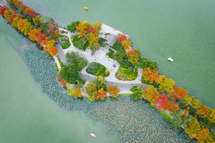 10月25日,游客在江苏省扬州市珠湖小镇赏秋游玩(无人机照片)。新华社发(齐立广 摄)