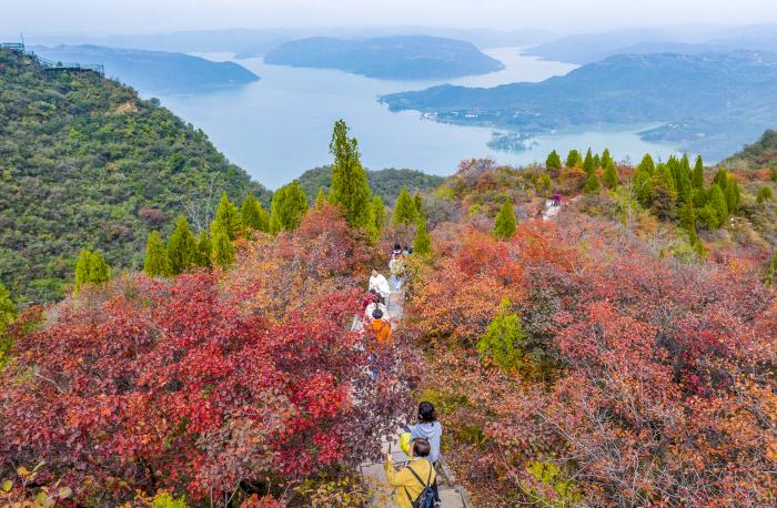 10月25日,游客在河南省洛阳市新安县荆紫仙山景区观赏红叶(无人机照片)。新华社发(张怡熙 摄)