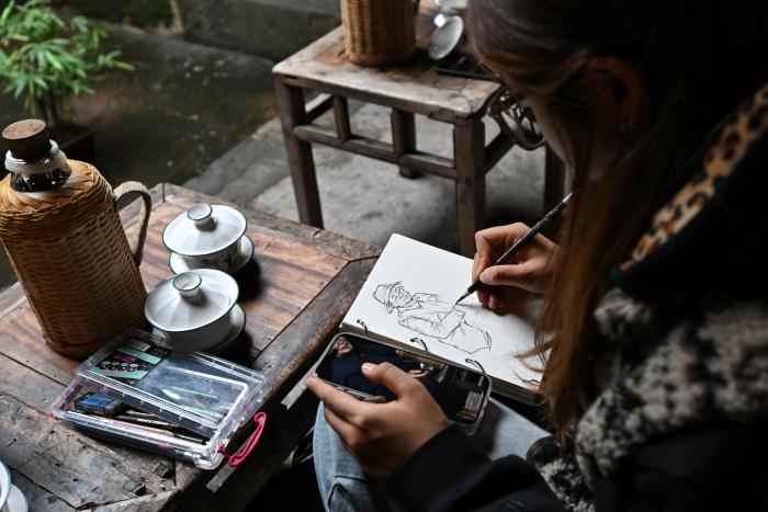 10月25日,一名来自西安的美术专业学生在成都金琴老茶馆内写生。