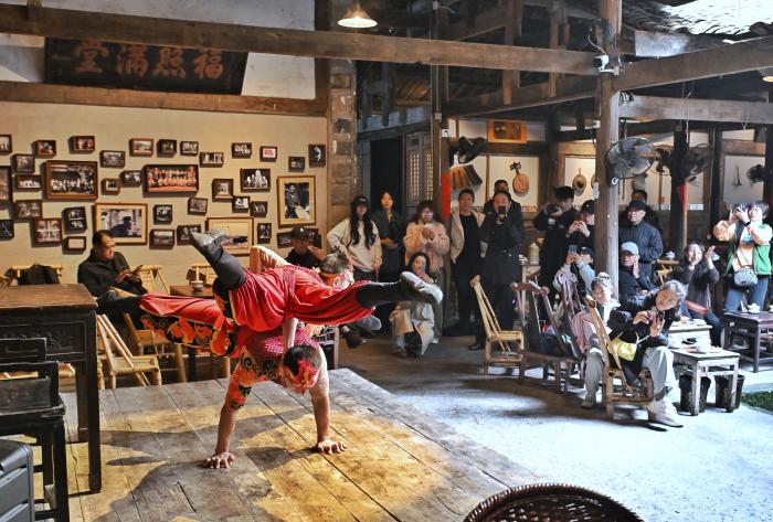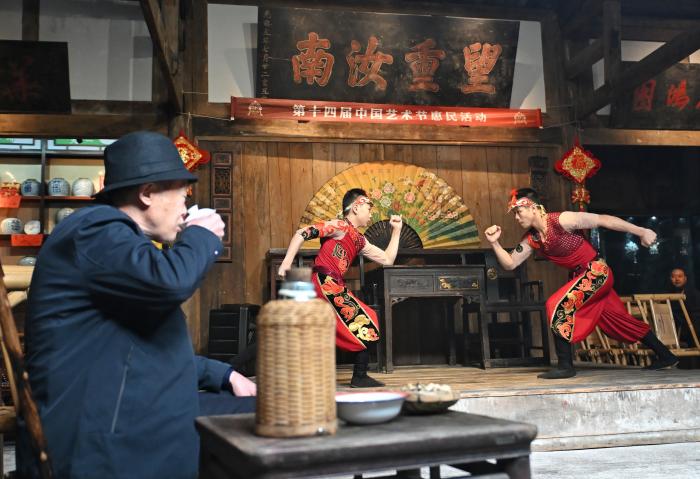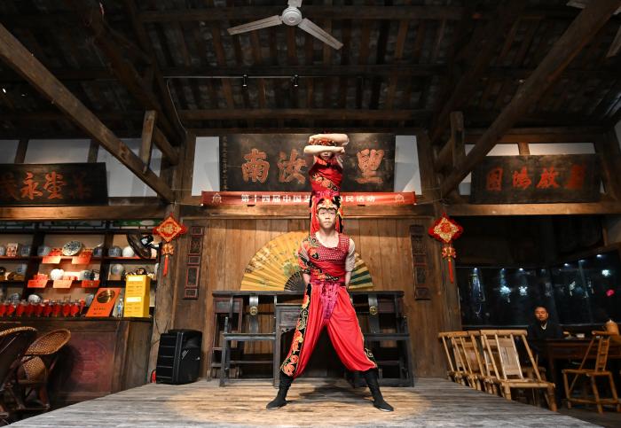 10月25日,作为第十四届中国艺术节惠民活动,沈阳杂技演艺集团的杂技演员在成都金琴老茶馆上演杂技节目《男子对手》。