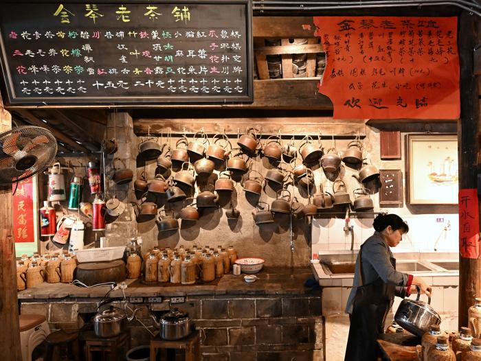10月25日,成都金琴老茶馆工作人员在准备开水。