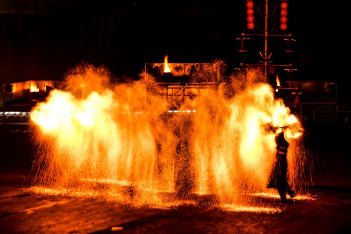 这是10月23日拍摄的忻州古城内的“火壶”表演。