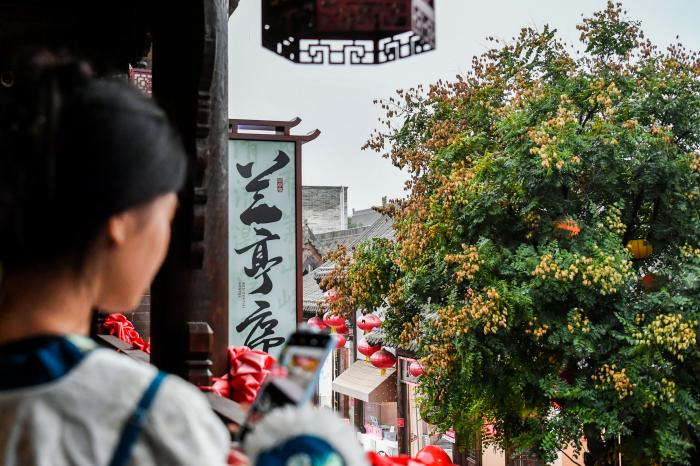 10月22日,身着古装的游客在拍摄忻州古城街景。