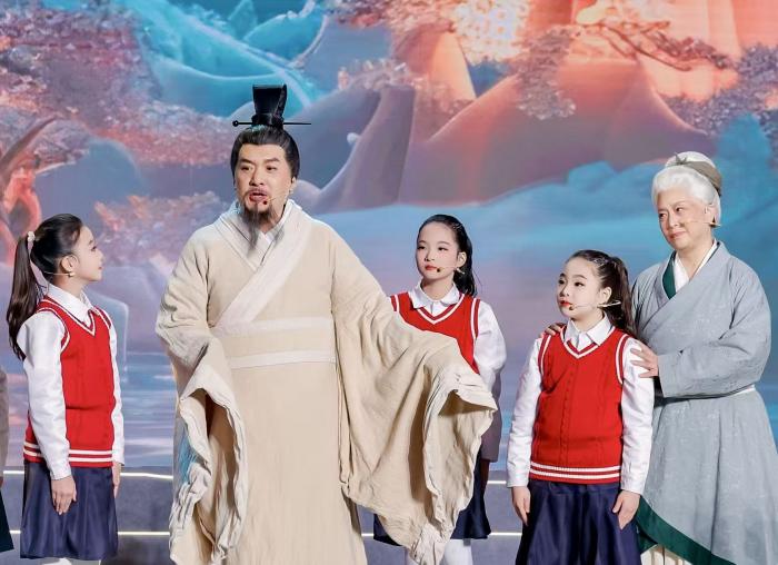 小演员与中老年演员在晚会上表演。