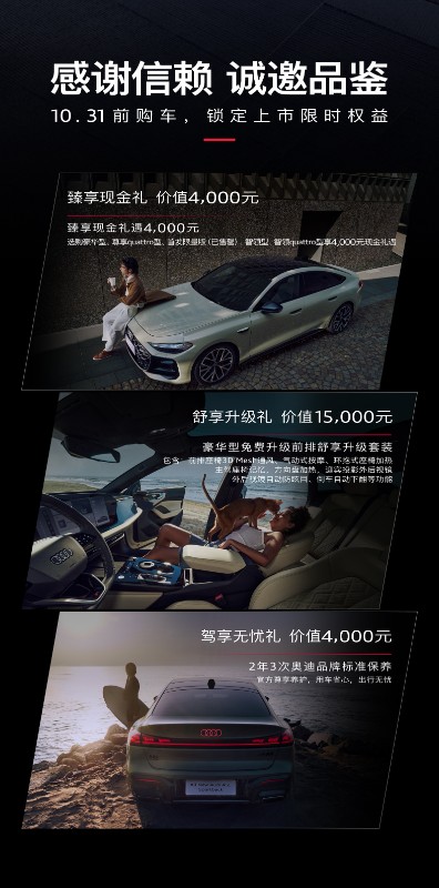 为回馈首批用户的青睐,A5L Sportback于上市首销期间特别推出多重购车礼遇。选购豪华型、尊享quattro型、智领型、智领quattro型的用户,均可享受4,000元现金优惠,直接降低购车门槛。选购豪华型的用户还可免费升级价值15,000元的前排舒享套装,其中包含前排座椅3D Mesh通风、气动按摩、环抱式座椅加热、主驾座椅记忆、方向盘加热、迎宾投影外后视镜、外后视镜自动防眩目及倒车自动下翻等多项高端配置,真正实现“入门即豪华”的越级体验。此外,所有购车用户均可获赠价值4,000元的“驾享无忧礼”,内含2年3次奥迪品牌官方养护服务,全方位保障用车品质与安心体验。A5L Sportback首销专属礼遇将于10月31日截止,即刻预定,锁定超值用车权益。