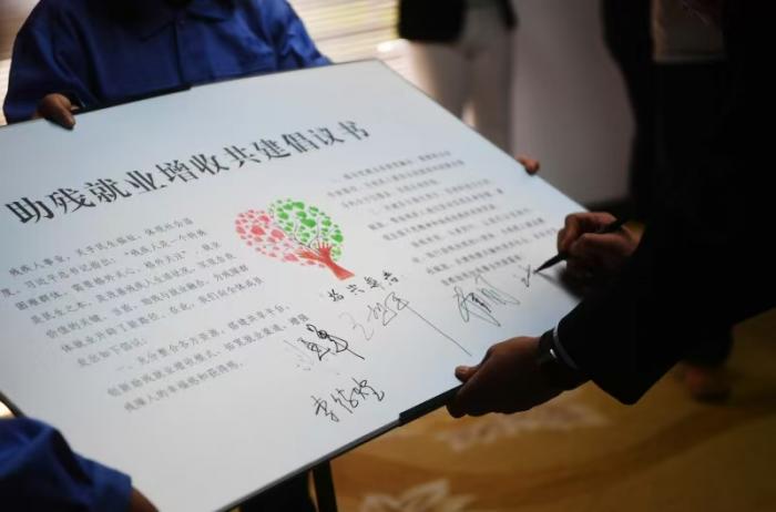 与会嘉宾在《助残就业增收共建倡议书》上签名。