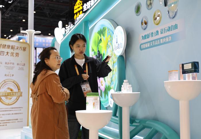 11月8日,在第八届进博会消费品展区,参观者(左)听工作人员介绍健康保健产品。新华社记者 方喆 摄