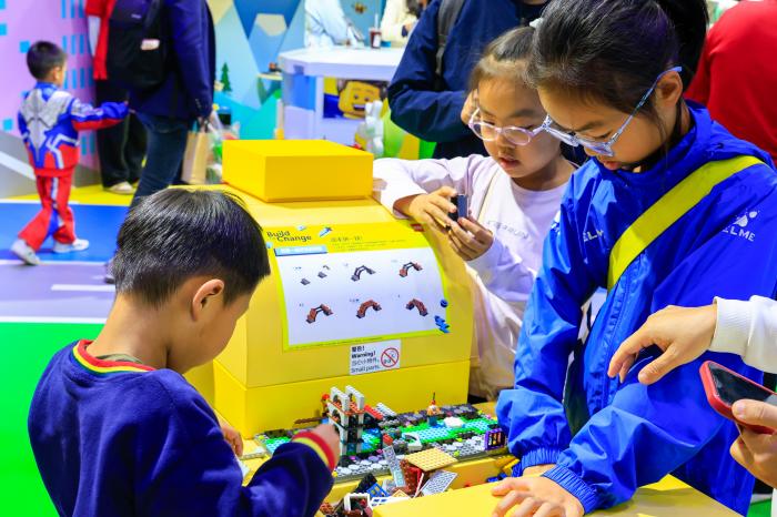 11月8日,在第八届进博会消费品展区,儿童在乐高展台动手体验积木。新华社记者 刘佳琪 摄