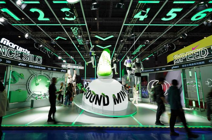 这是11月8日在第八届进博会消费品展区拍摄的亚瑟士展台。新华社记者 杜昕怡 摄