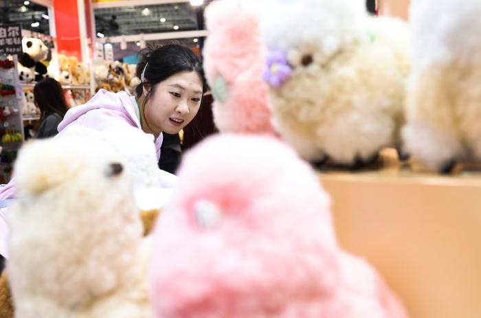 11月8日,在第八届进博会消费品展区,参观者在秘鲁温暖驼品牌的羊驼毛制品前驻足观看。新华社记者 方喆 摄
