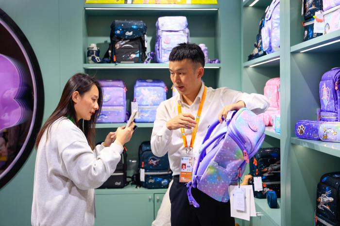 11月8日,在第八届进博会消费品展区,观众(左)在一家儿童书包品牌展台咨询产品。新华社记者 刘佳琪 摄