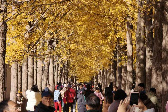 11月9日,北京青年报记者在北京甘家口附近的一处银杏大道看到 ,今日阳光明媚,周末午后前来打卡拍照的市民熙熙攘攘络绎不绝。