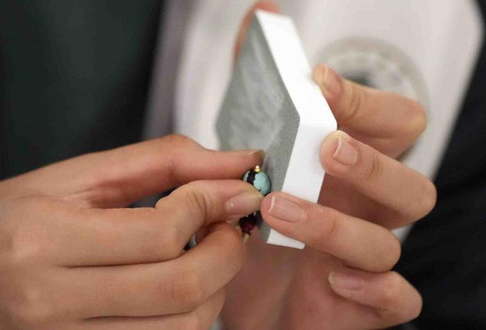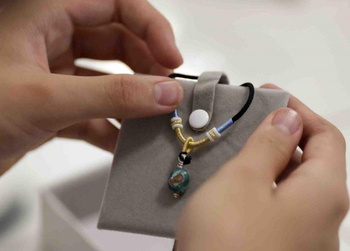 同学包装好自己亲手镶嵌的绿松石项链,带回京送给家人。
