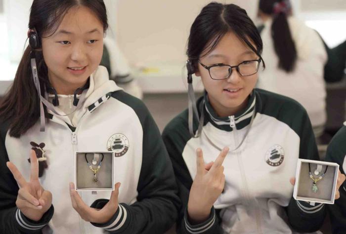 同学们展示制作的绿松石项链,拍照留念。