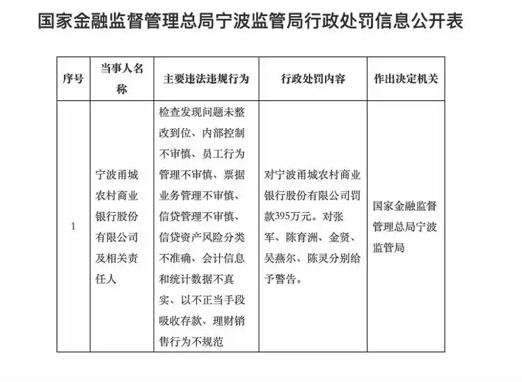 日前,国家金融监督管理总局宁波监管局公示的行政处罚信息显示,宁波甬城农村商业银行股份有限公司(下称“甬城农商银行”)因多项违法违规行为,被处以罚没 395 万元的行政处罚,另有5名相关责任人张军、陈育洲、金贤、吴燕尔、陈灵均被予以警告。