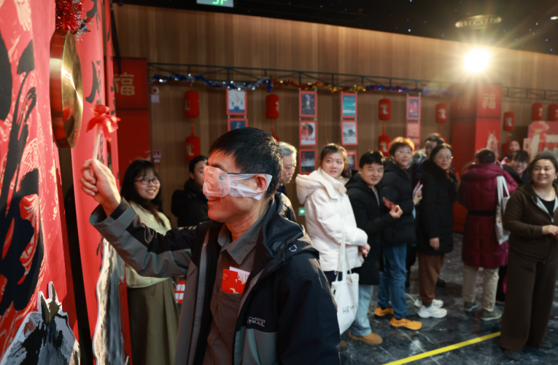 3月3日下午,北京国际戏剧中心·人艺小剧场的前厅和舞台年味儿十足,观众手持巧妙拆解为“北、京、人、艺”四字的马头集章卡,游走于多个游艺打卡点,每参与一项活动即可获得一枚专属印章,集齐四枚印章后可兑换神秘礼品。在“相亲相爱一家人”主题景框前,观众驻足合影,定格团圆瞬间;“投壶纳福”则将传统投壶游戏与人艺经典剧名巧妙结合,标有“全家福”与“玩偶之家”的两只壶,参与者将贴有不同剧名的箭矢投入对应壶中,方寸之间重温经典;“一锤定音”则考验参与者的默契与台词功底,蒙眼的参与者在同伴的提示下,说出一句人艺经典台词或两部剧名后方可敲响铜锣;“经典台词猜灯谜”环节,灯谜墙上贴着精心遴选的台词——既有《茶馆》《雷雨》等经典剧目的传世名句,也有《张居正》《正红旗下》等近年新创剧目的精彩台词,参与者准确猜出剧名,即可获赠人艺精心准备的书籍奖品。