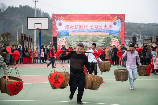 1月16日,在湖南省辰溪县孝坪镇坪里村,村民们参加担谷子比赛。当日,湖南省辰溪县孝坪镇坪里村举办农民趣味运动会,全村100多名农民选手参加了拔河、担谷子、制作糍粑、蒙眼摸鸭、巧手媳妇、篮球联谊赛等趣味项目,快快乐乐迎新年。