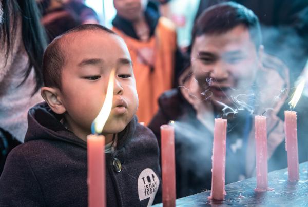 1月18日,小朋友参加吹蜡烛比赛。当日,“红红火火过大年·多彩贵州迎新春”社区趣味运动会在贵州六盘水市六枝特区举办。来自郎岱、龙场等12个易地扶贫安置社区的600余名群众,在聚福新苑易地扶贫小区参加了旱地龙舟、勇挑重担、投壶、拔河等趣味运动,开心快乐迎接新年到来。
