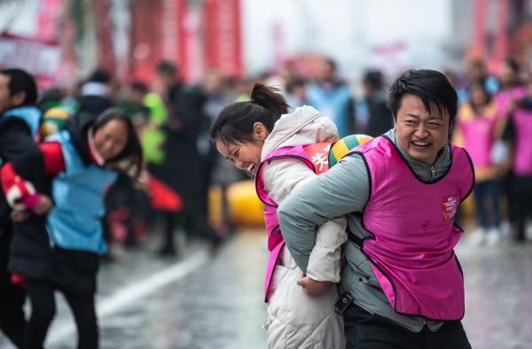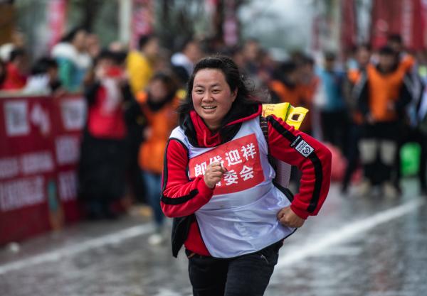 1月18日,来自当地易地扶贫安置社区的群众参加勇挑重担比赛。