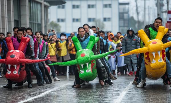 1月18日,来自当地易地扶贫安置社区的群众参加旱地龙舟比赛。