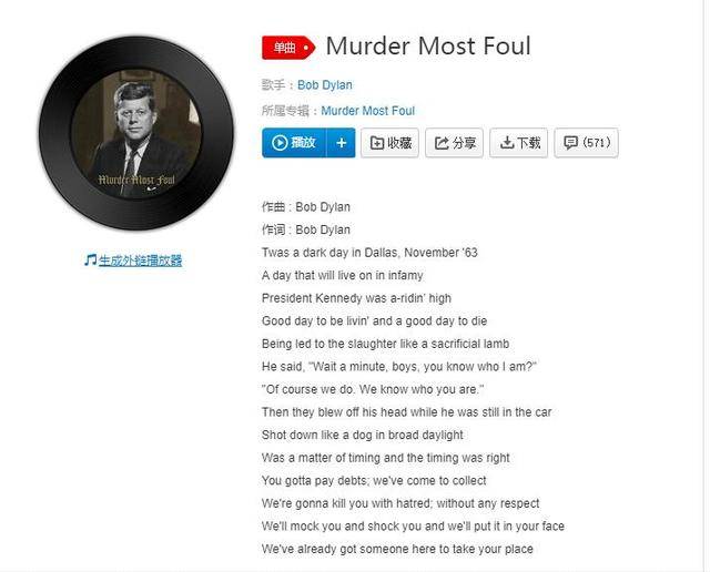 据悉,这首歌长达17分钟,歌曲内容以美国前总统肯尼迪遇刺案为背景,这也是继2012年以后时隔8年他发行的第一首原创歌曲。